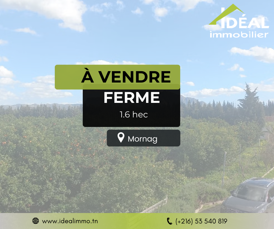 Une occasion rare! Une ferme de 1,6 hectare, située à Mornag, est actuellement disponible à la vente. Voici ce que cette propriété comprend :