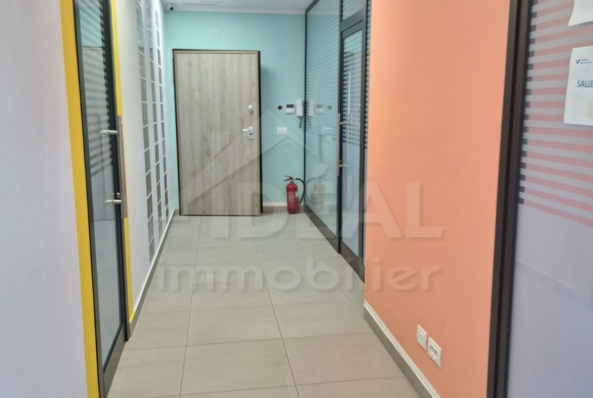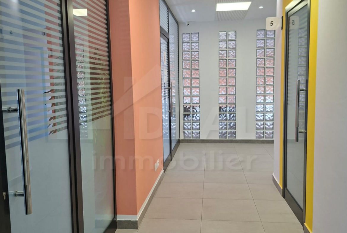 Cet espace professionnel se compose de 5 bureaux spacieux et d’une salle d’eau, offrant un cadre de travail confortable et fonctionnel.